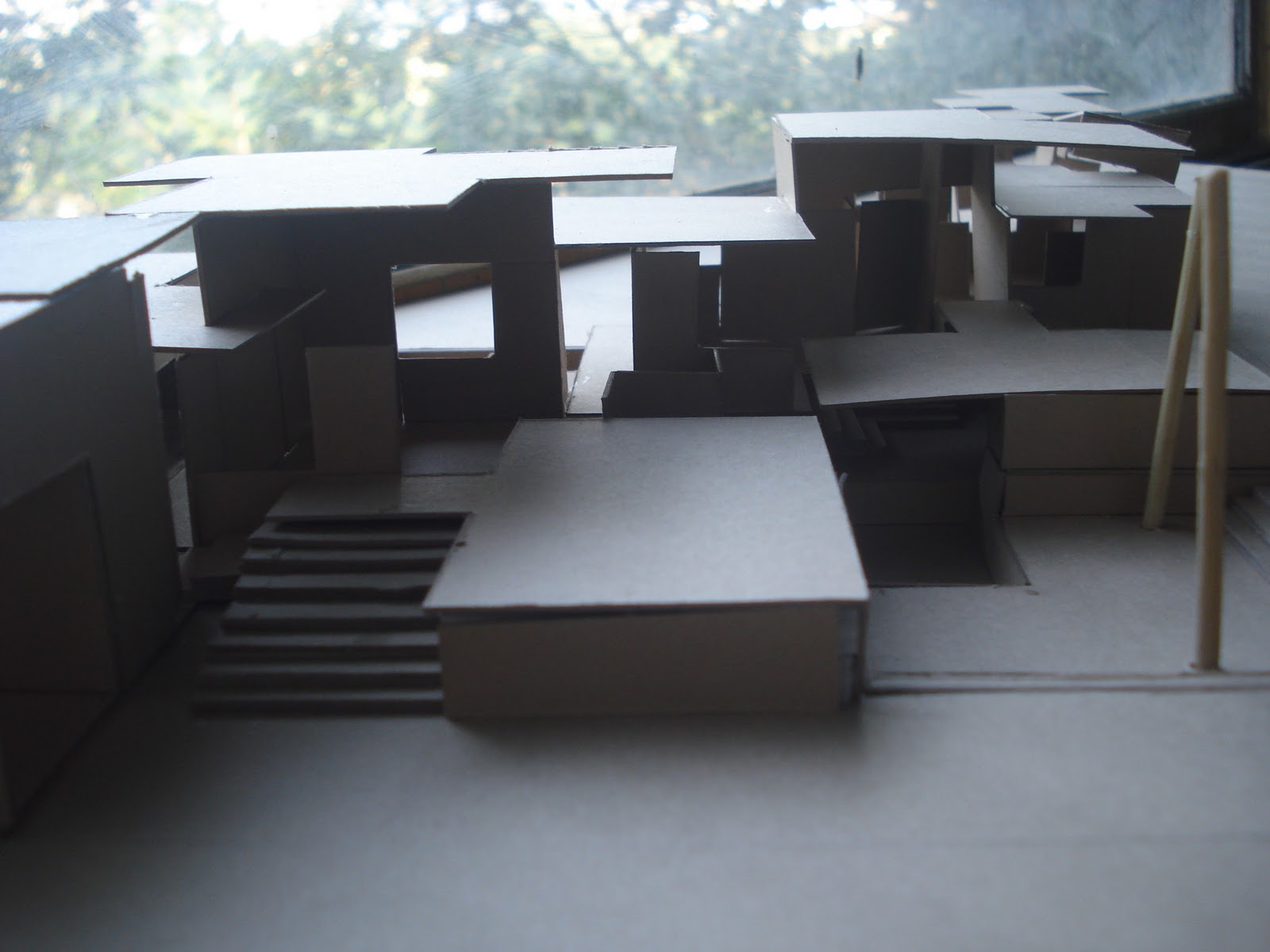2. Rishad Netarwala / process driven: Rishad's work reflected the indefatigable innocent play of cut-fold module that he came up with during the initial stage of his project. This flat module which encapsulated a variety of spaces when rhythmically cut and folded became the prime generator and regulator of space. By virtue of the module, Rishad's design did not need, nor had any special openings in his building. The module folded in to building elements of the roof, wall and the plinth leaving gaps between them (as they joined) to form sky lights, semi open spaces or inner courts.